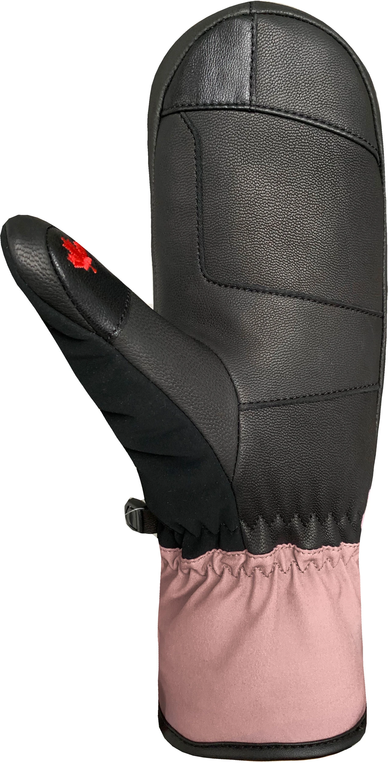 It is always a good day on the slopes when your hands are kept warm. Stay dry and cozy with the Snow Angel mitt, a mix of chrome free goatskin, neoprene and softshell polyester making up its shell. The index finger area is touch screen responsive via the e-touch pad built into the mitt. A velcro strap debossed with an eco logo adds a more secured closure on the cuff which also has a removable leash equipped with a PowGirl by Auclair bracelet.