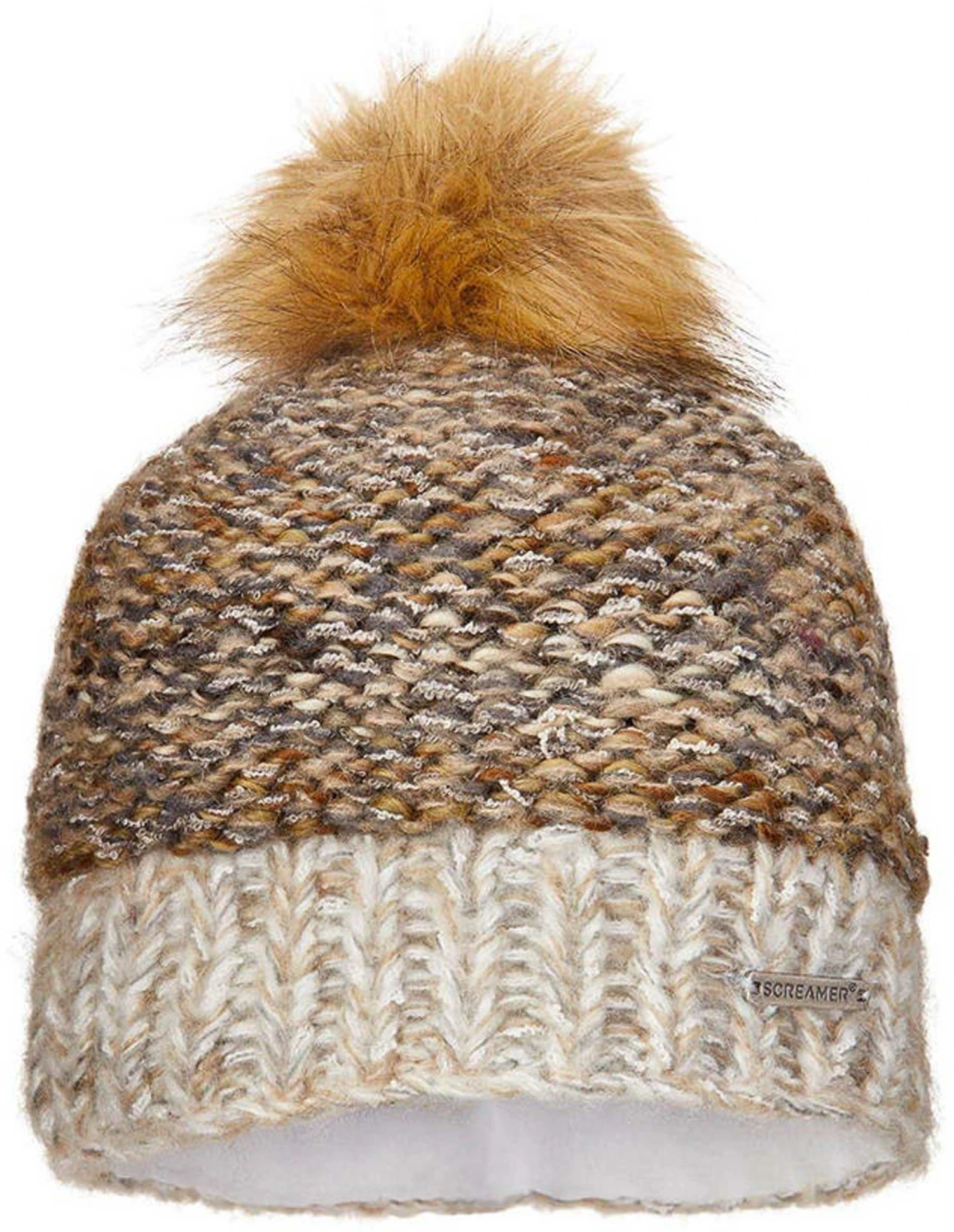 Perfect beanie lets you fight the cold weather in style. Hand knit with space dyed wool blend yarns in a variety of tonal colors. Extra long faux fur pom. Super warm and super good looking for those extra cold winter days.Space dyed wool blend beanie with faux fur pomHandknit beanieFleece band lining