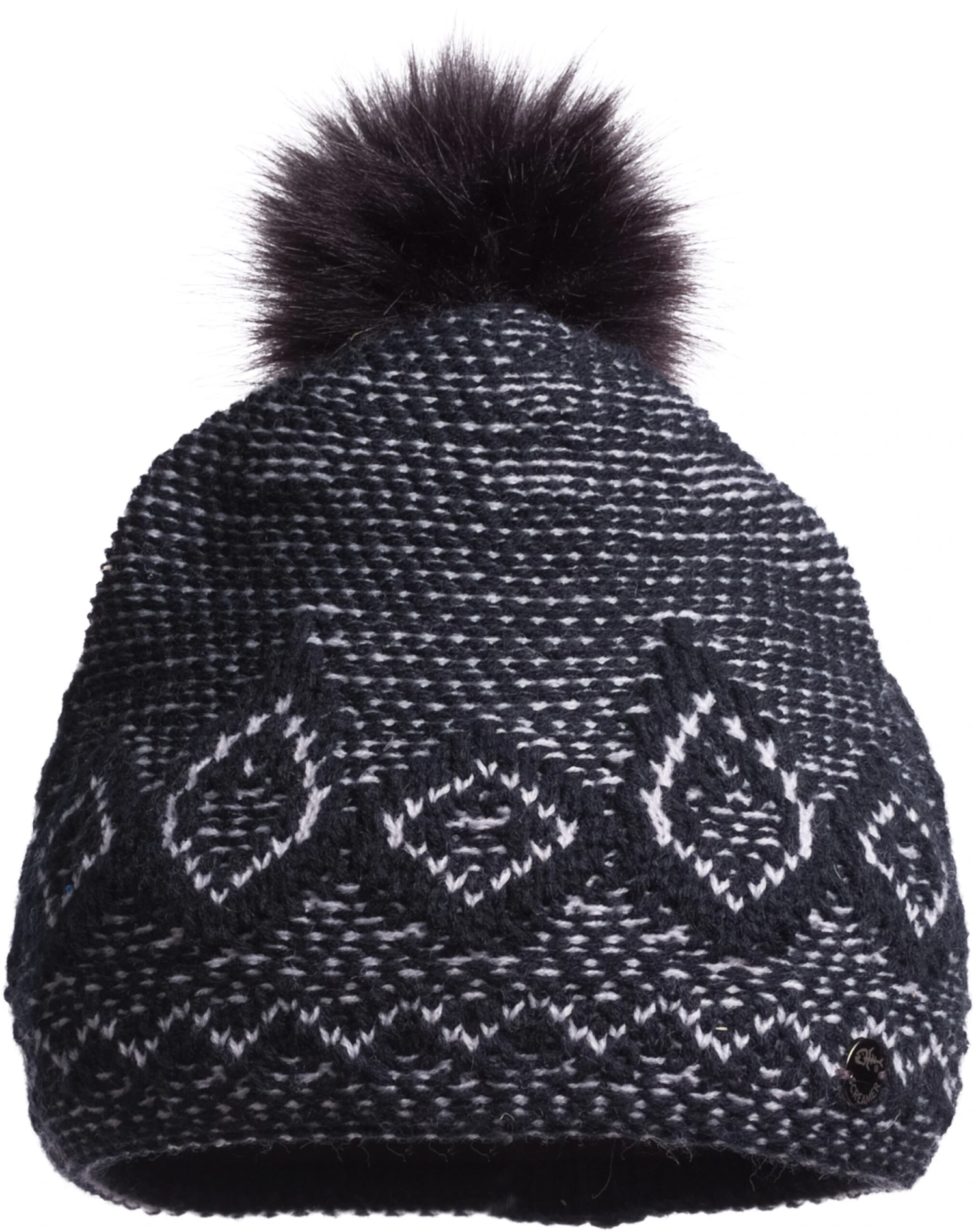 A textured hat with contrasting colors ready for cold weather and a cup of coffee.